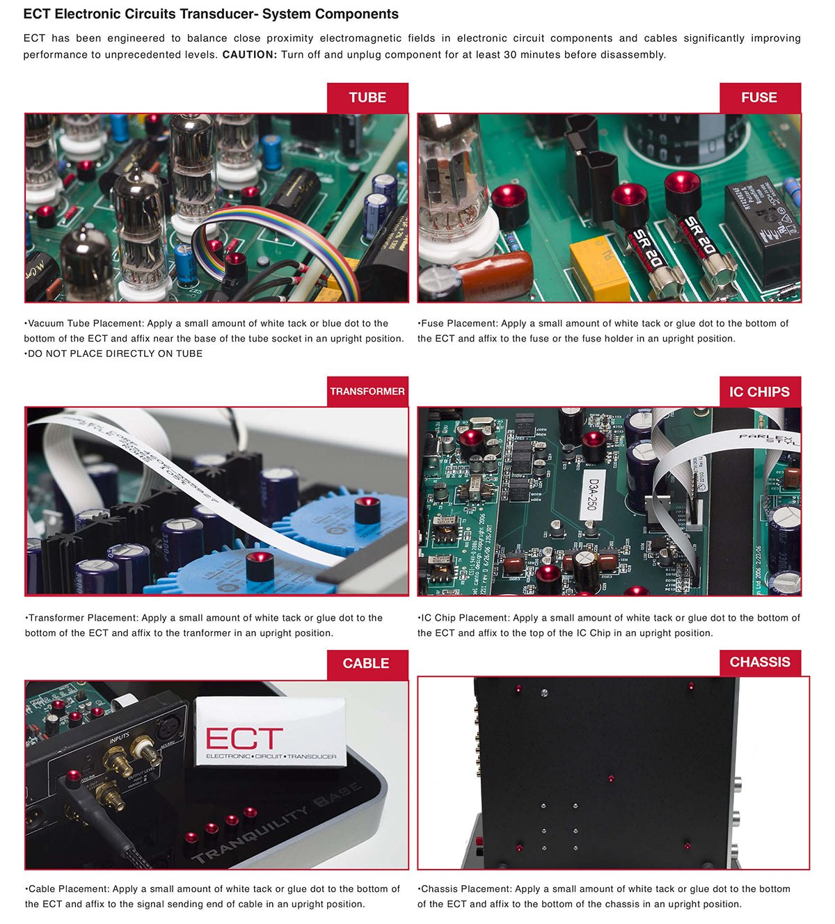 ECTs clean up high frequency noise that otherwise distort harmonic structures within the music signal. When ECTs are placed on or in an electronic device UEF nano-particles within the ECTs are excited by the components EM fields and in turn are balanced by the ECTs reaction through the process of inductive coupling. With ECT’s you hear music with a lower noise floor, higher resolution and a significant increase in soundstage scale with improved mid-range clarity and low frequency control. In fact once you place ECTs in your system, you’ll never want to take them out. Available for a risk-free, 30-day in-home trial, audition ECT’s with complete confidence.