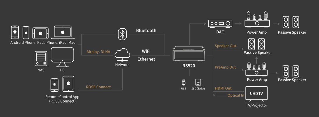 RS520 is an all-in-one product with built-in network player, DAC, and amplifier. For DAC and amplifier module, it is equipped with ES9038PRO DAC, the flagship DAC chip of ESS technology and Class AD amplifier module developed by applying new material GaN FET are mounted. RS520 is an advanced all-in-one network streamer that consolidates the main functions of existing all-in-one streamers into one based on ROSE's unique design know-how and functions accumulated over many years.