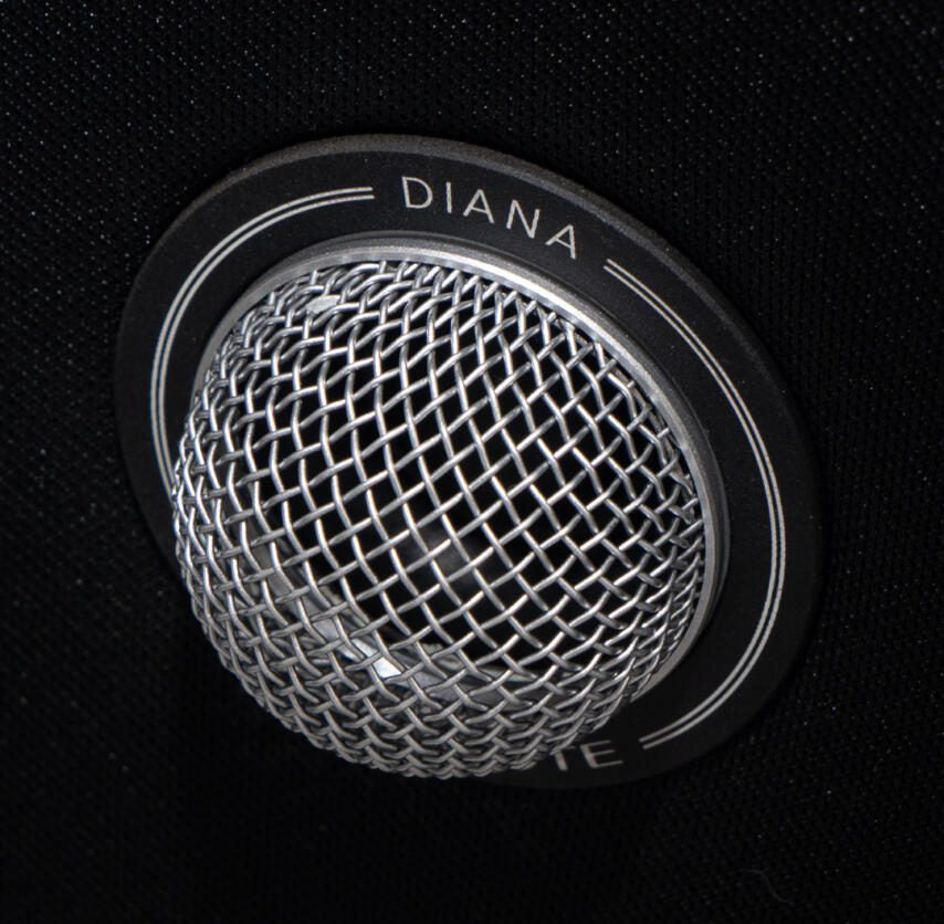 Diana II has been designed to offer high-quality audio combined with a distinctive aesthetic style. The various color combinations allow the loudspeaker to be adapted to any need and interior decor, creating a perfect balance between sound performance and design. The fabric is available in two variants: Black Rebel, which gives a bold and sophisticated character, and Grey Artic, an elegant and versatile choice that easily integrates into any space. The phaser is available in three finishes: gold – for a touch of luxury and refinement, silver – ideal for those seeking brightness and elegance, and black – a timeless classic that suits any style.