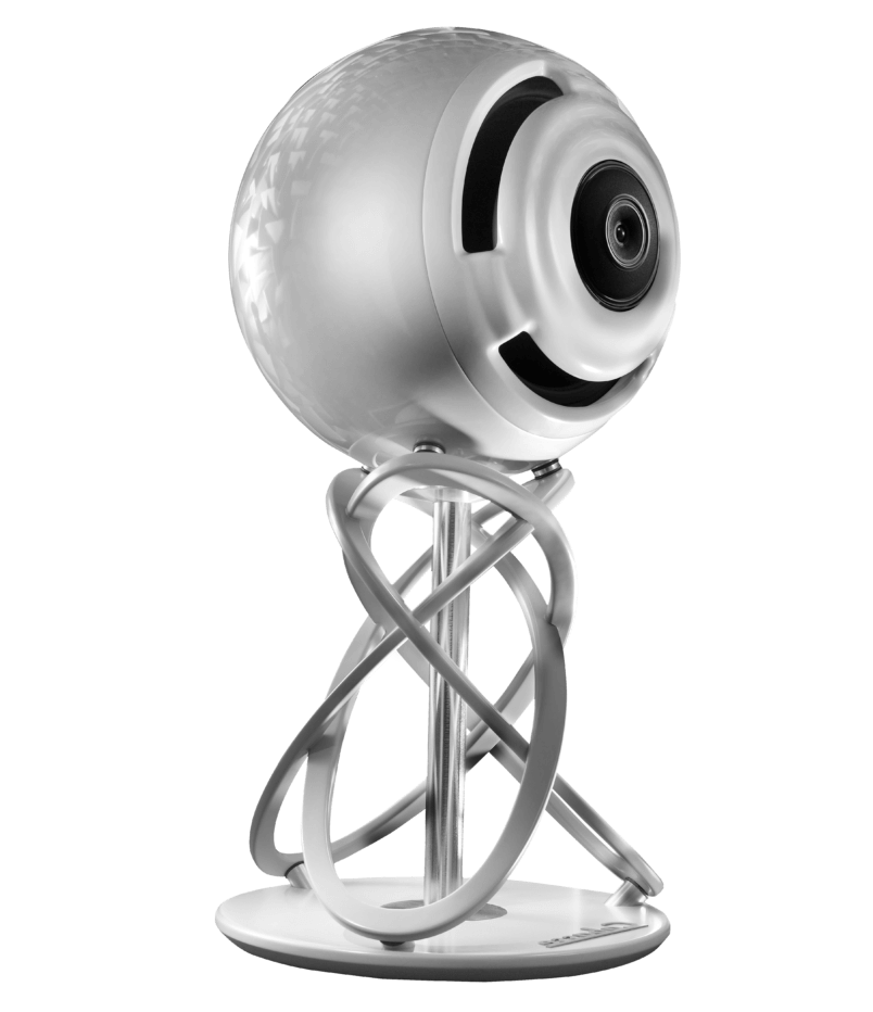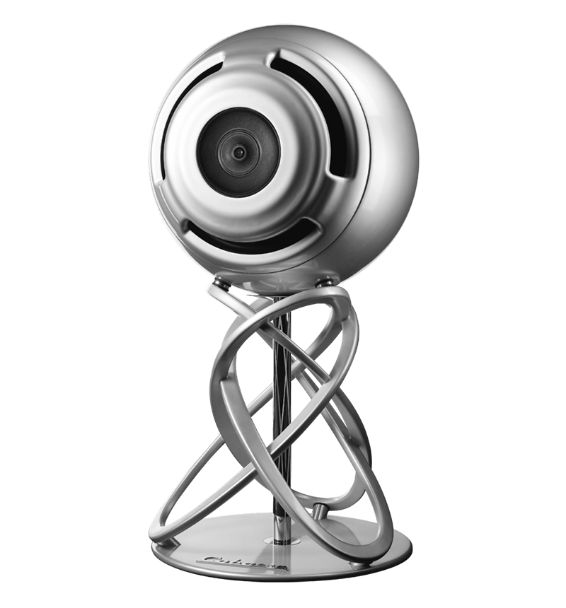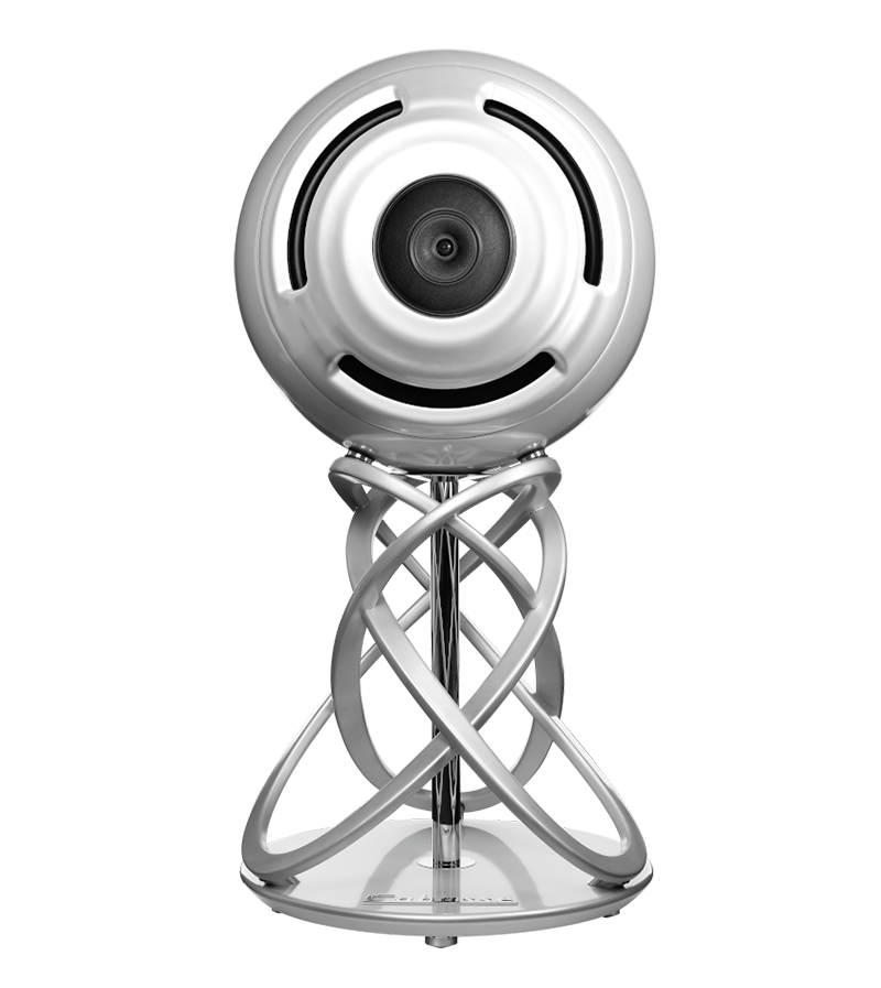 The 70cm spherical speaker, made from a sandwich of composite materials originally designed for the European space program, is coupled to the die-cast aluminum helical support, which positions the center of the speaker at a perfect listening height.