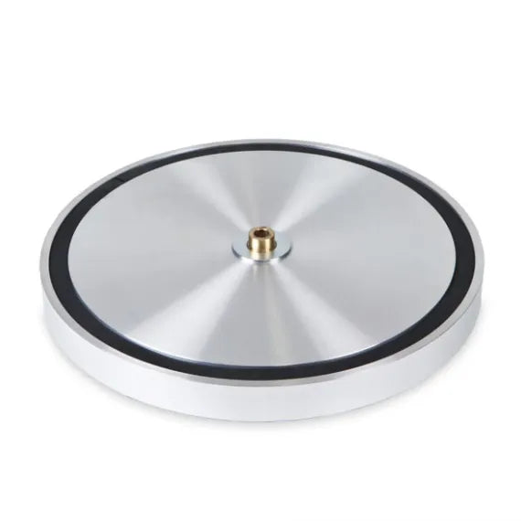 With its superlative magnetic feet, this heavy turntable literally floats over the surface. These powerful magnets effectively decouple the turntable from its below base.