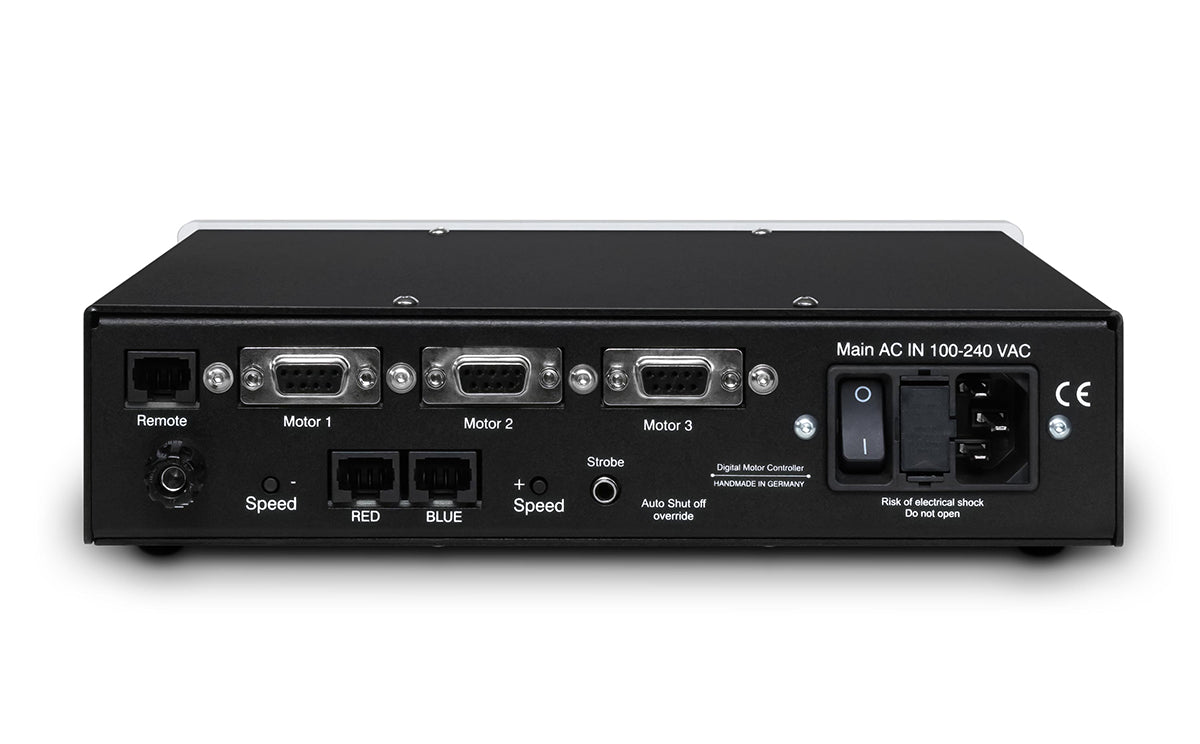 The turn­tables of the NEO series with three and more motors are control­led by the external, fully digital DMC-20 motor elec­tronics, which is connec­ted to the motors via RJ45 cables. By means of an “Auto­matic Vibra­tion Control” (“AVC”) deve­loped by Acous­tic Signa­ture, the distor­tions caused by the motors are measured in real time and – with a time delay that is imper­cep­tible to the listener – largely elimi­nated by adjus­ting the phase shifts to the motor signals.