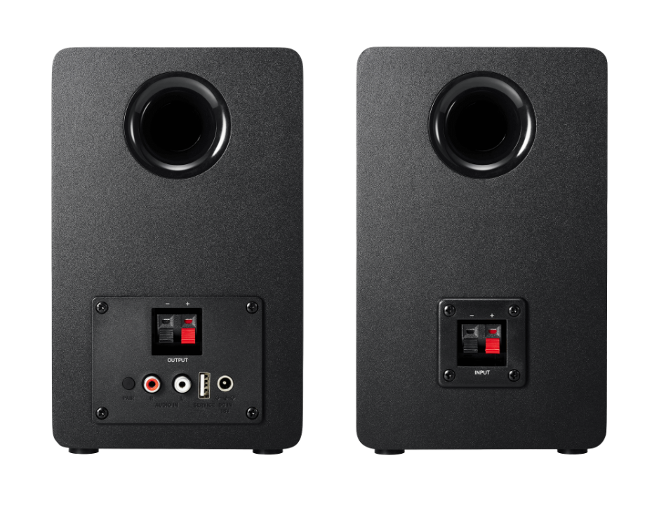 • Speakers are equipped with dual RCA jacks for wired connection and Bluetooth technology for wireless connection