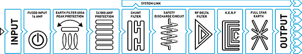 A unique high grade, high amperage mains noise choke based system is combined with a high frequency delta filter network to eliminate of both Common Mode and Differential Mode mains noise across a wide frequency range.